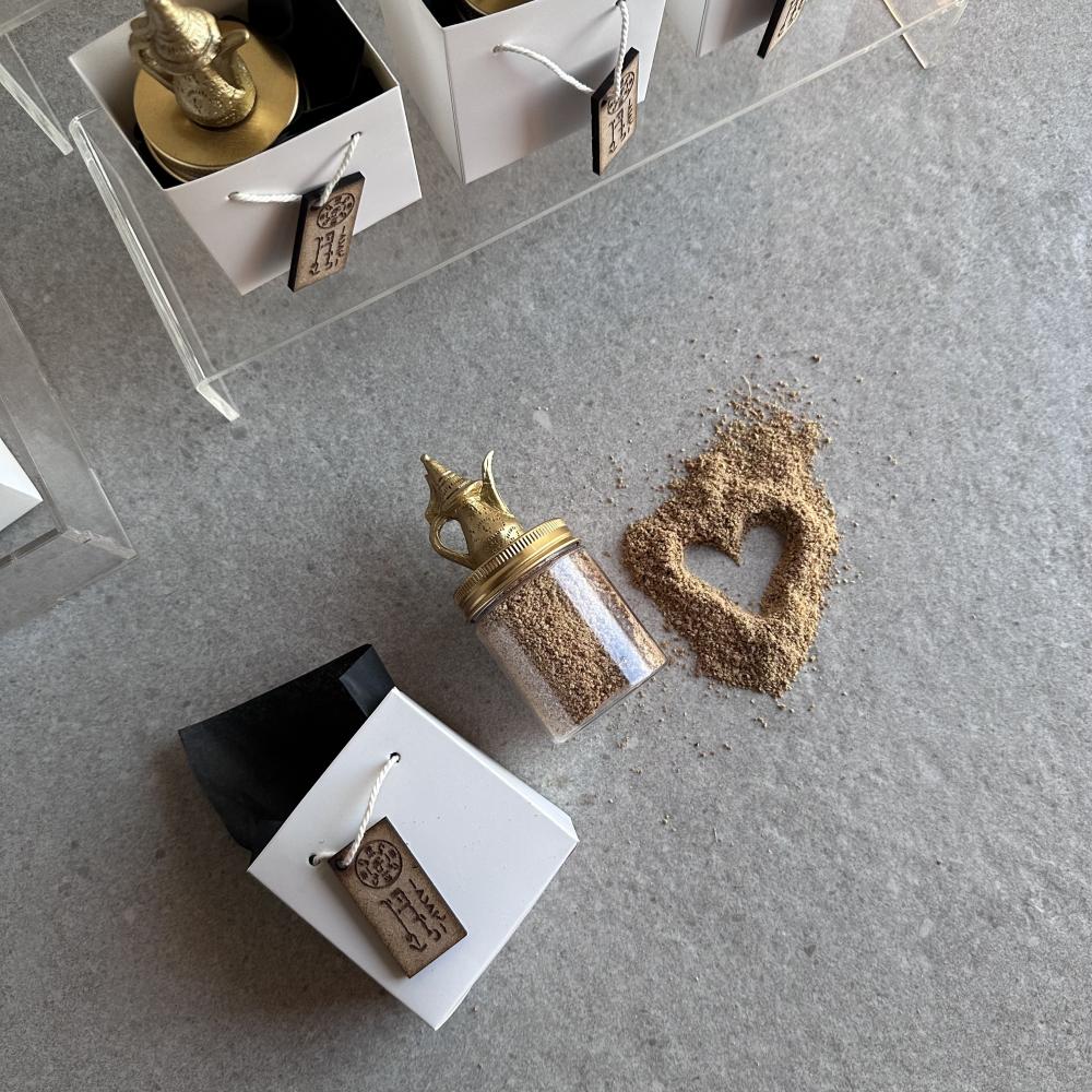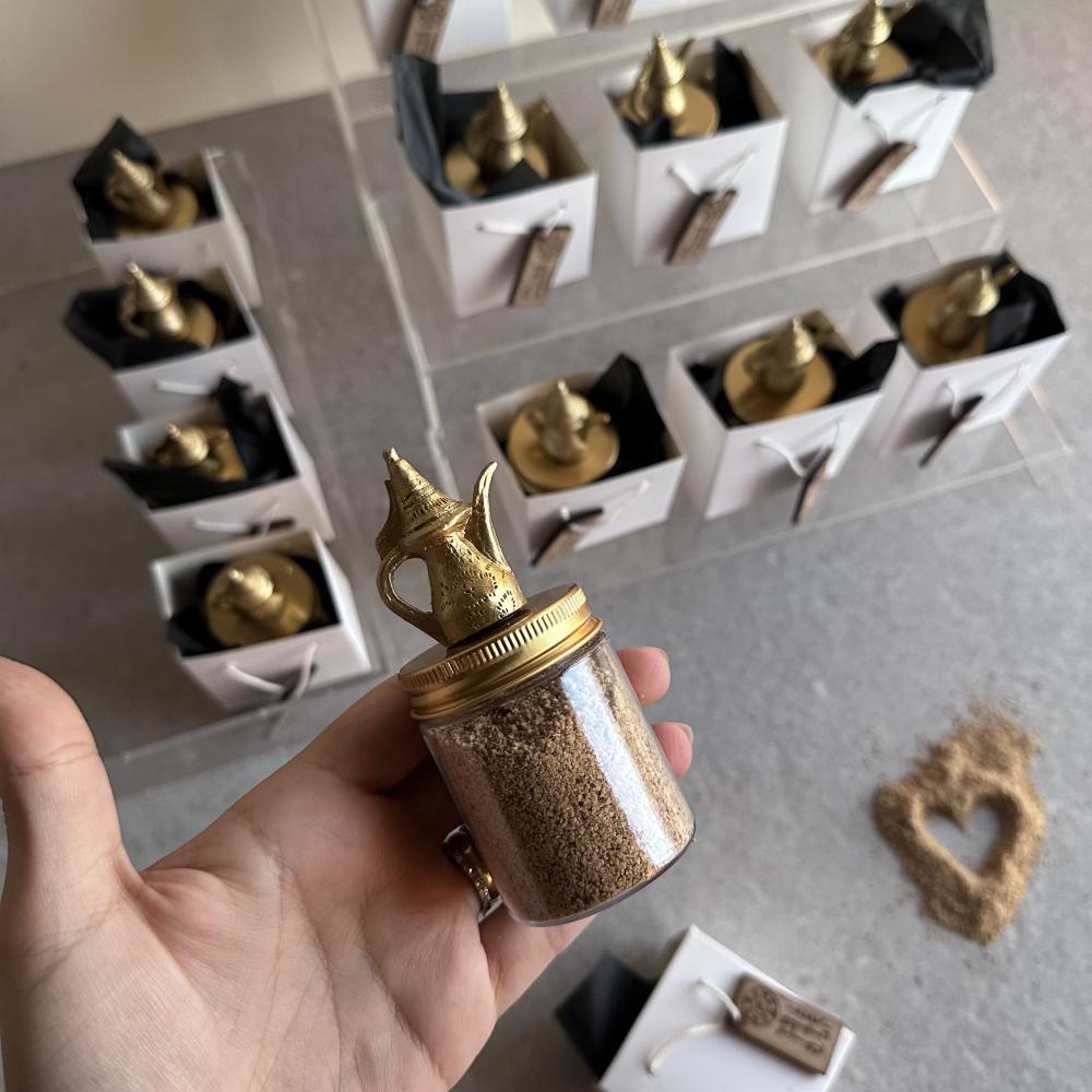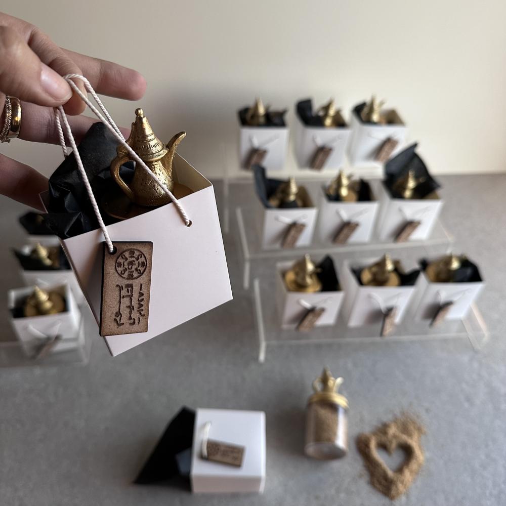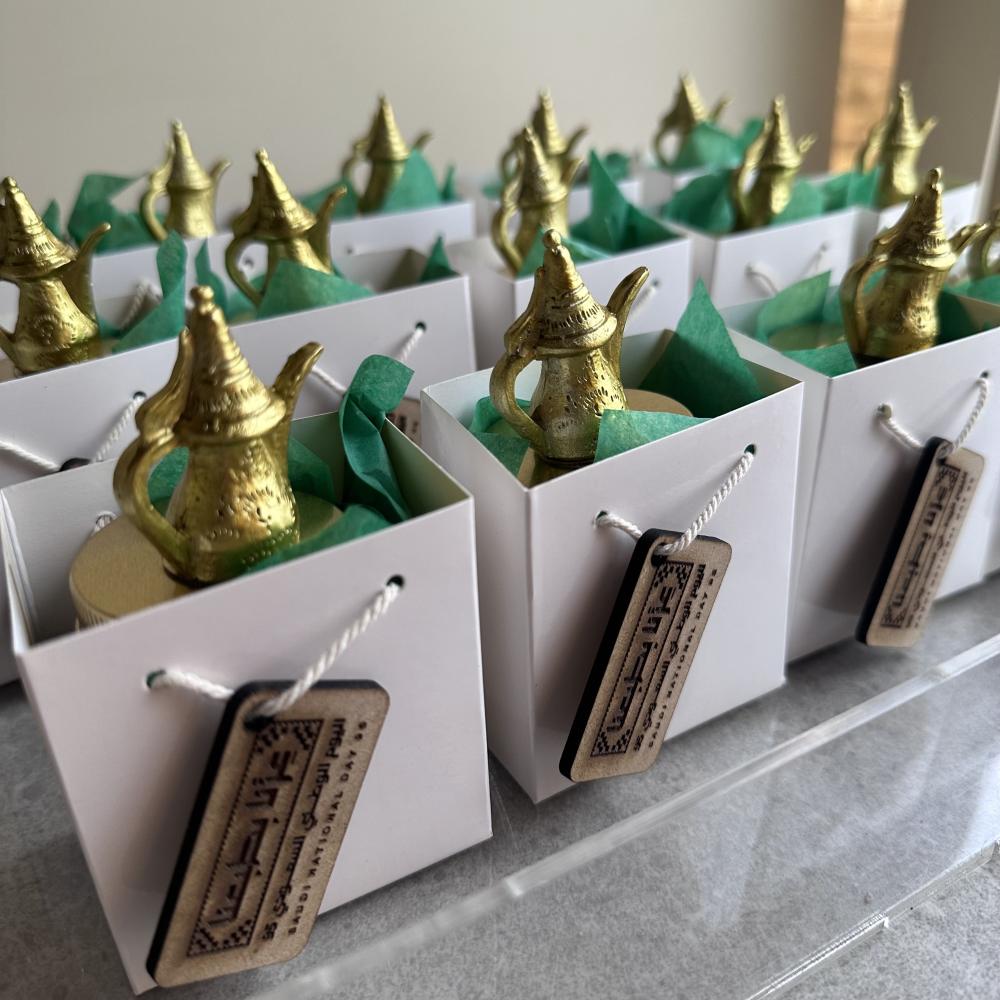 قهوة سعودية فاخرة مزينه بالدله مع كيس وتاق خشبي بأي عبارة او شعار حسب طلبكم